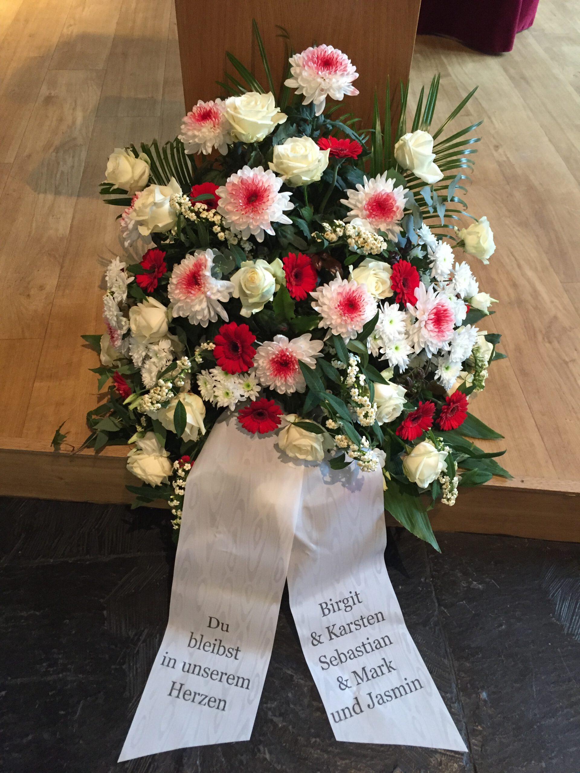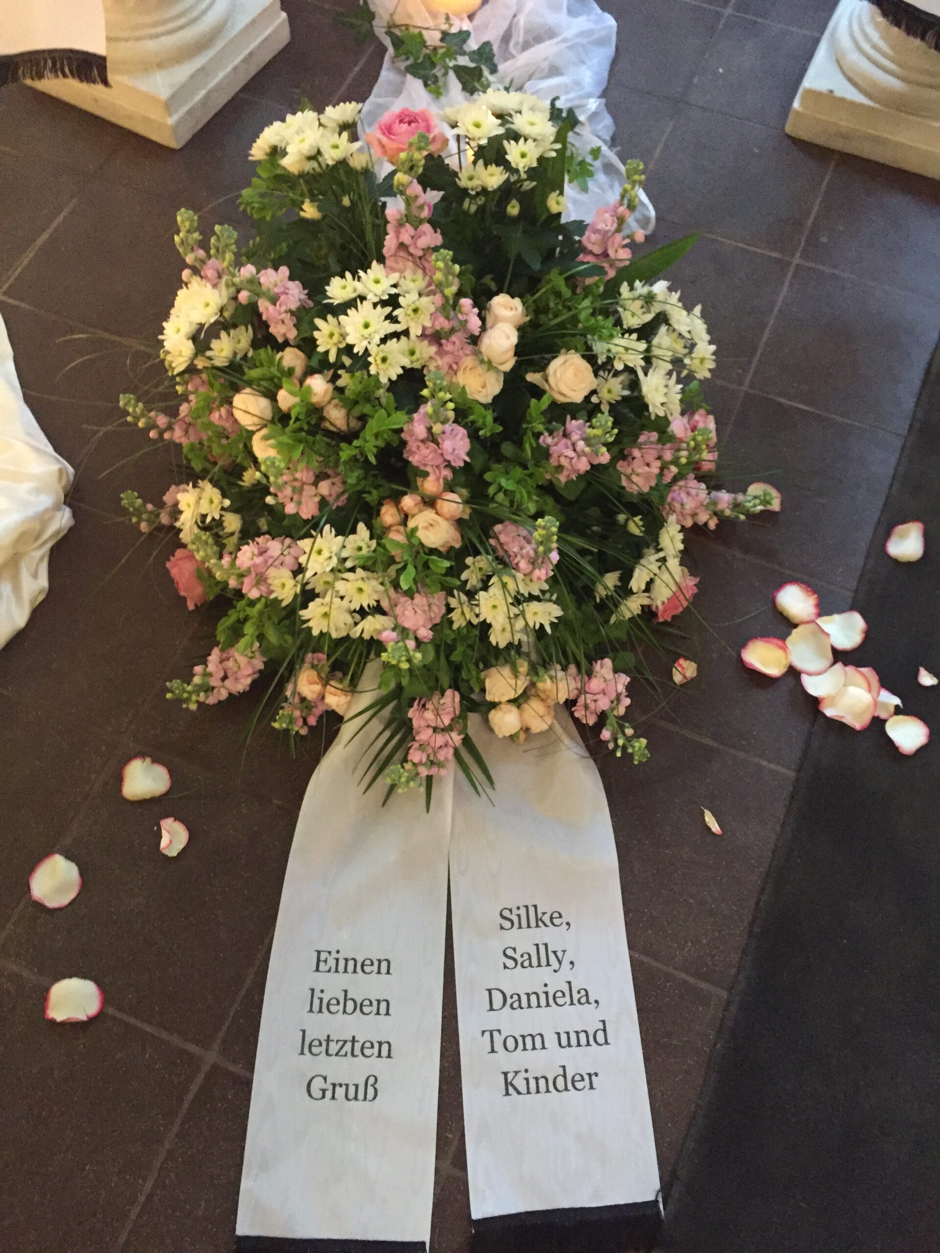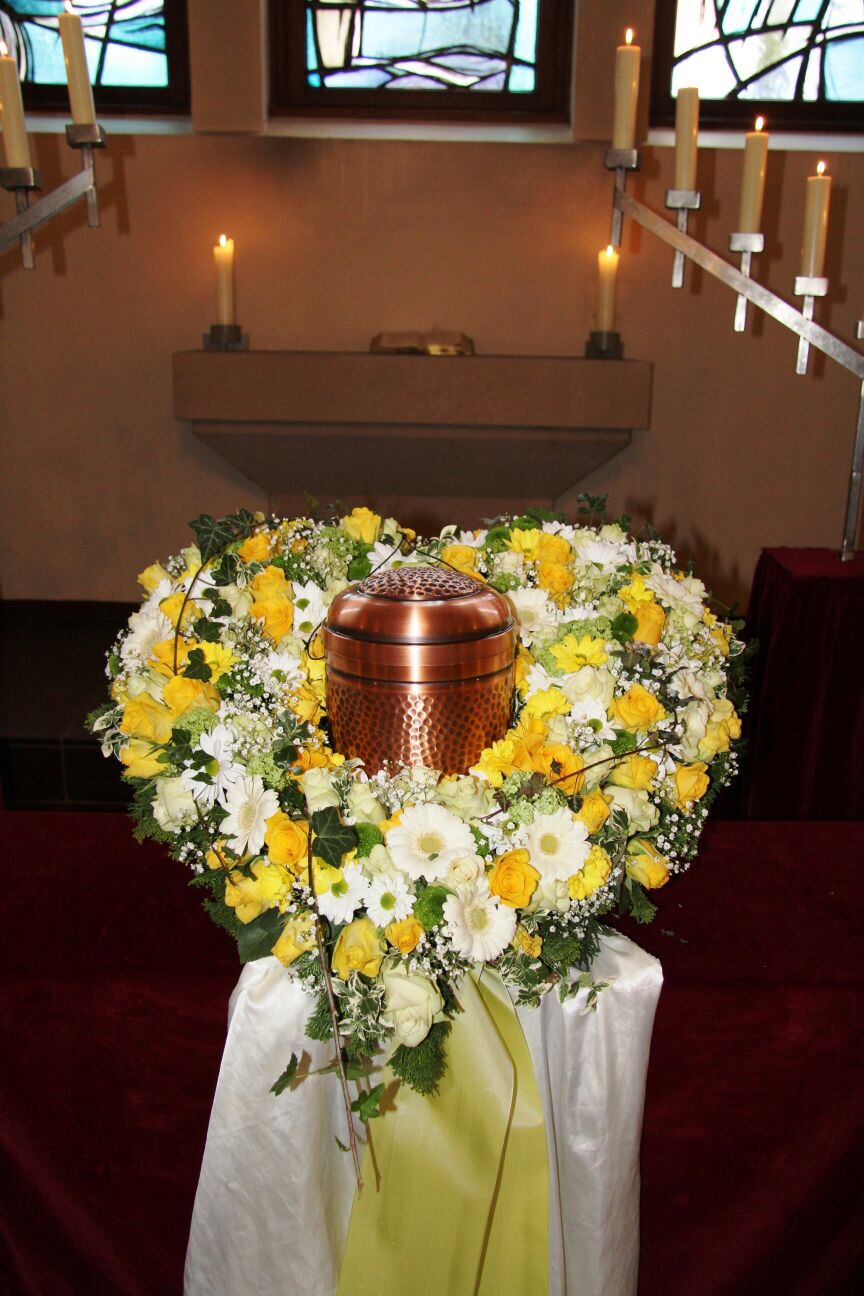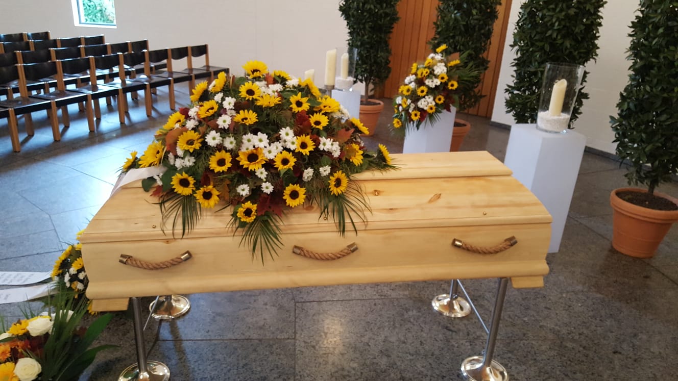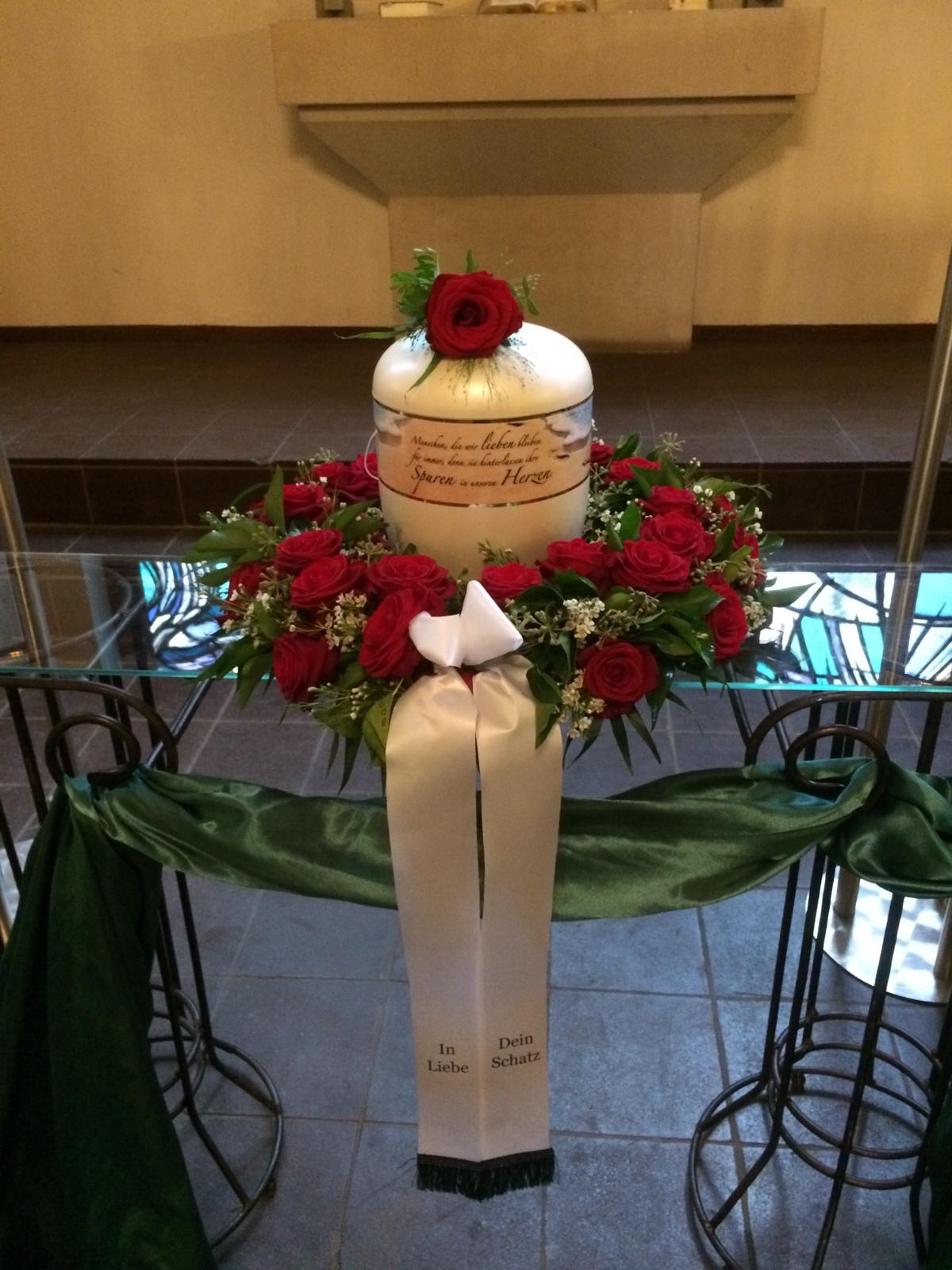 Passend zu Ihren Erinnerungen möchten wir das florale Umfeld schaffen. Dies wird den Abschied vermutlich nicht erleichtern, aber einen schönen Rahmen schaffen. Wir fertigen für Sie Sargdekorationen, Säulengestecke, verschiedene Trauergestecke, Trauerkränze, Liegesträuße und Urnenschmuck an. Ebenfalls ist es möglich einzelne Blumen oder Blütenblätter als Grabbeigabe zu bestellen. Die Schleifen für Gesteck und Kranz stellen wir in unserer Werkstatt selbst her – ganz nach Ihren Wünschen. Wenn Sie einen letzten Blumengruß für Ihre Liebsten, Freunde und Angehörige bestellen wollen, nehmen Sie Kontakt zu uns auf und wir besprechen Ihre Vorstellungen.