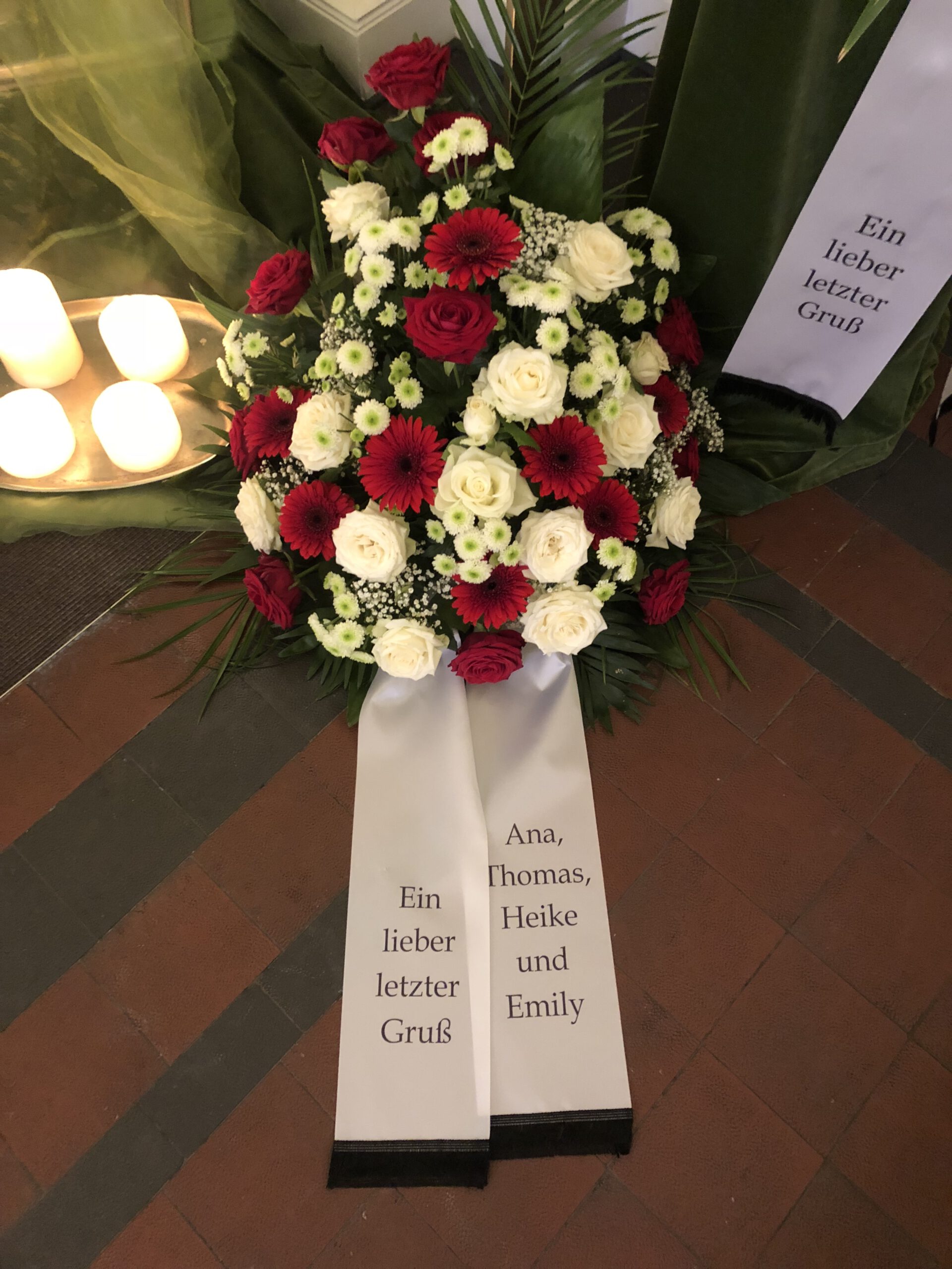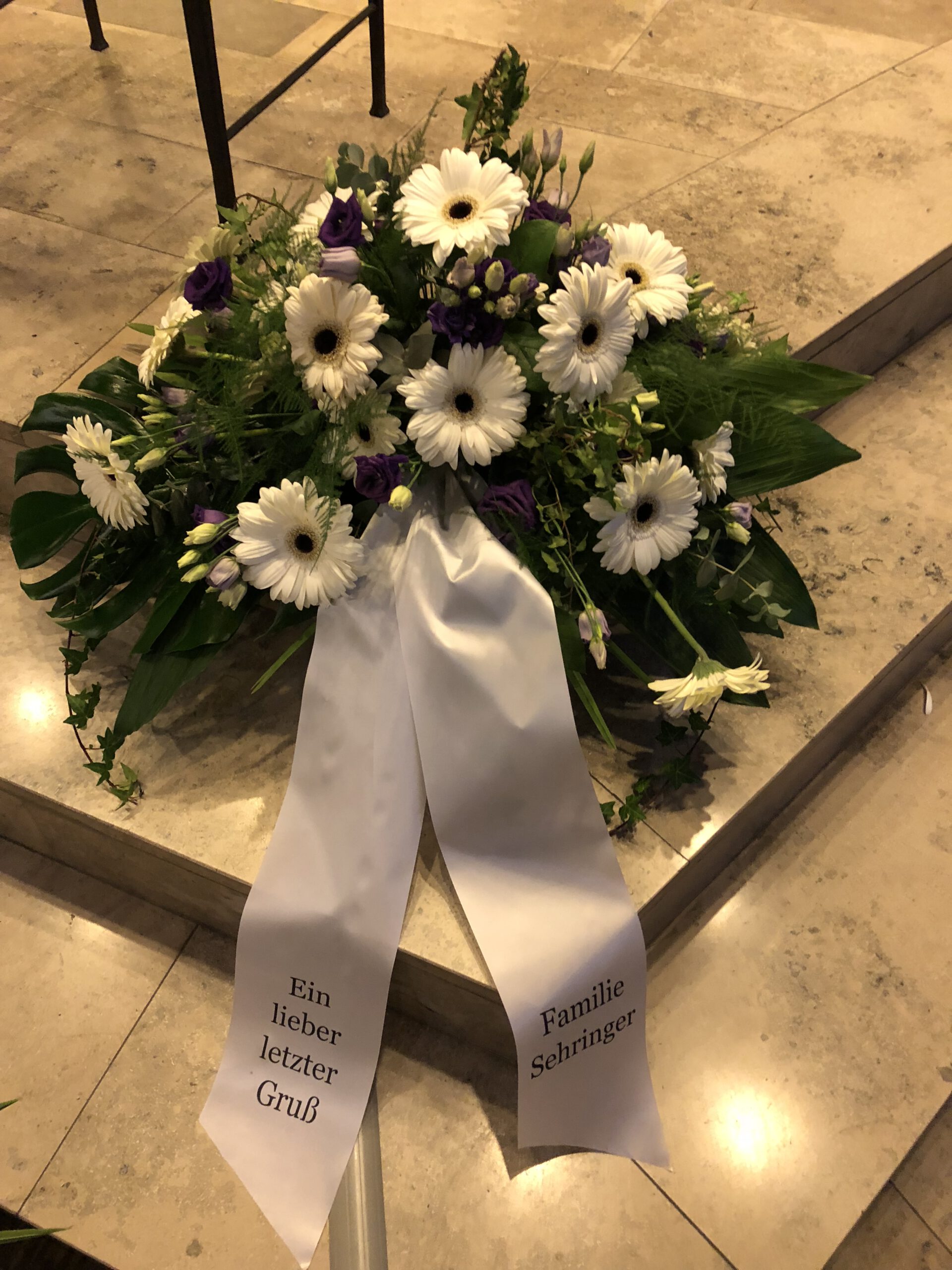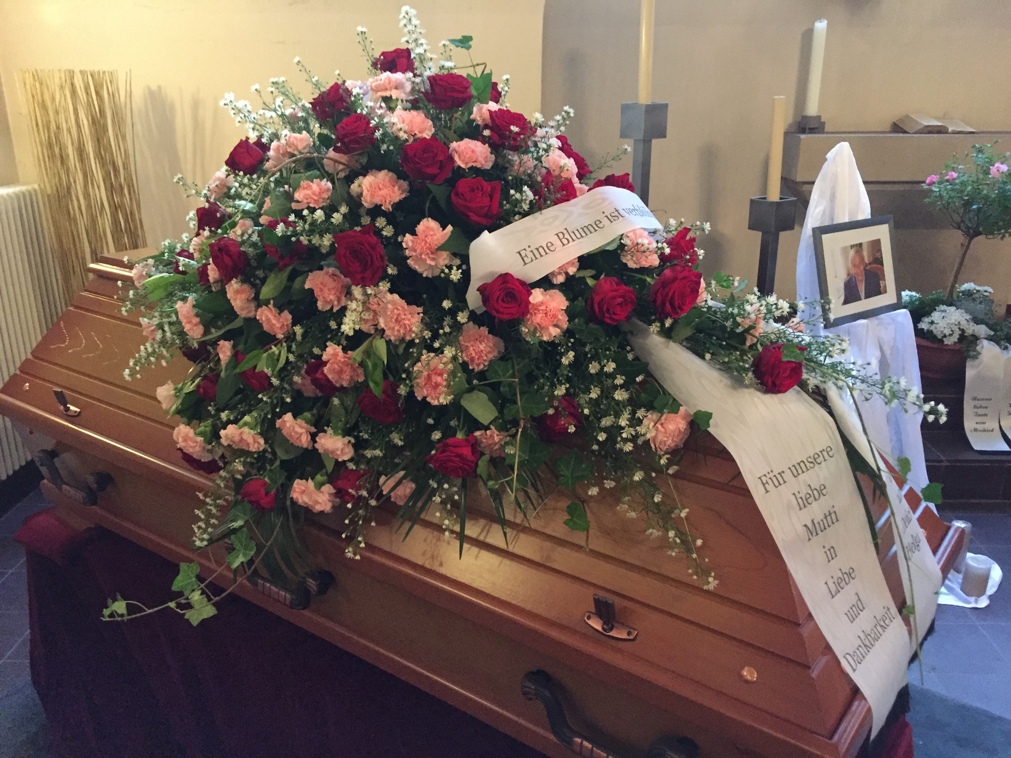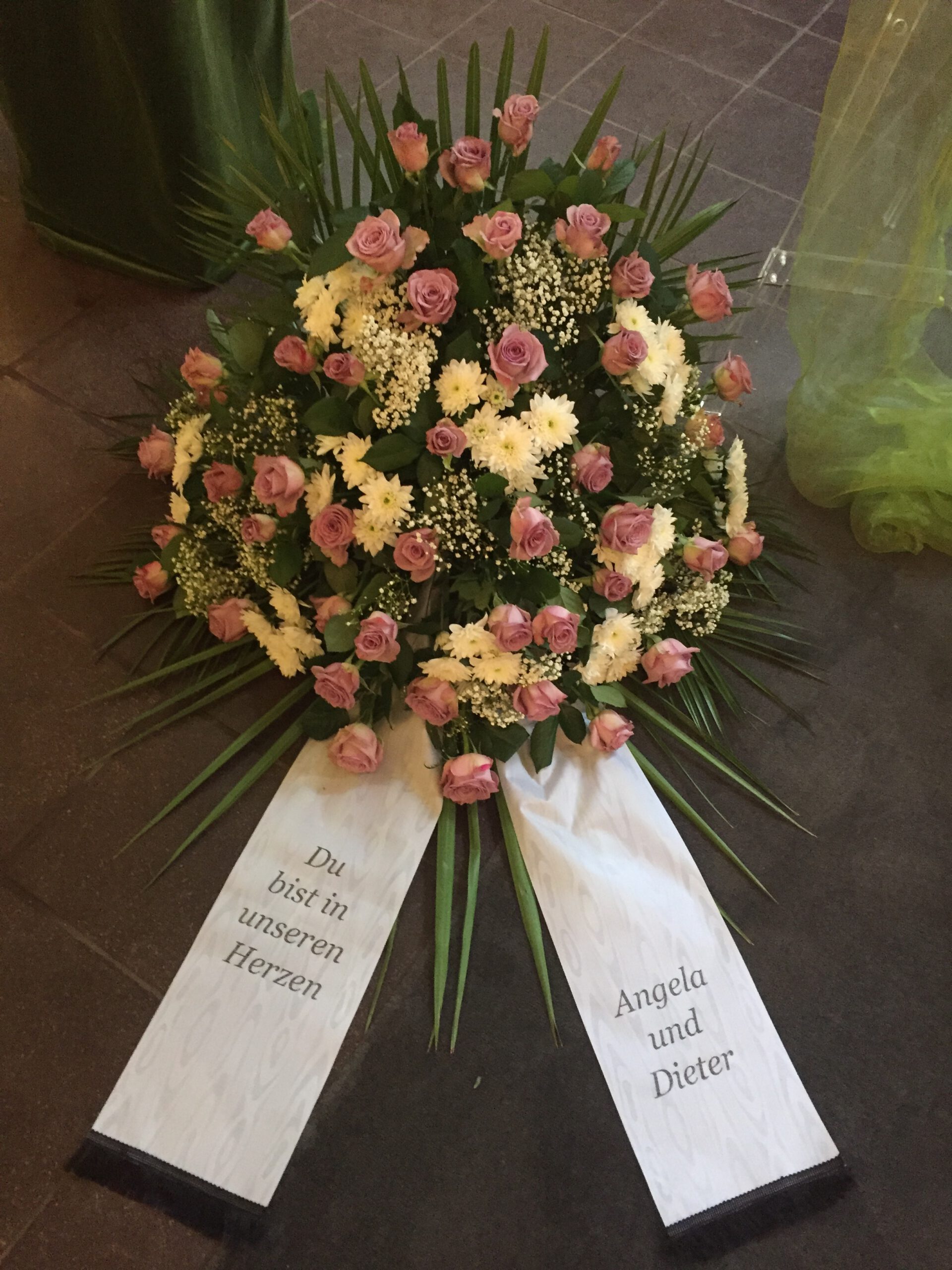 Passend zu Ihren Erinnerungen möchten wir das florale Umfeld schaffen. Dies wird den Abschied vermutlich nicht erleichtern, aber einen schönen Rahmen schaffen. Wir fertigen für Sie Sargdekorationen, Säulengestecke, verschiedene Trauergestecke, Trauerkränze, Liegesträuße und Urnenschmuck an. Ebenfalls ist es möglich einzelne Blumen oder Blütenblätter als Grabbeigabe zu bestellen. Die Schleifen für Gesteck und Kranz stellen wir in unserer Werkstatt selbst her – ganz nach Ihren Wünschen. Wenn Sie einen letzten Blumengruß für Ihre Liebsten, Freunde und Angehörige bestellen wollen, nehmen Sie Kontakt zu uns auf und wir besprechen Ihre Vorstellungen.