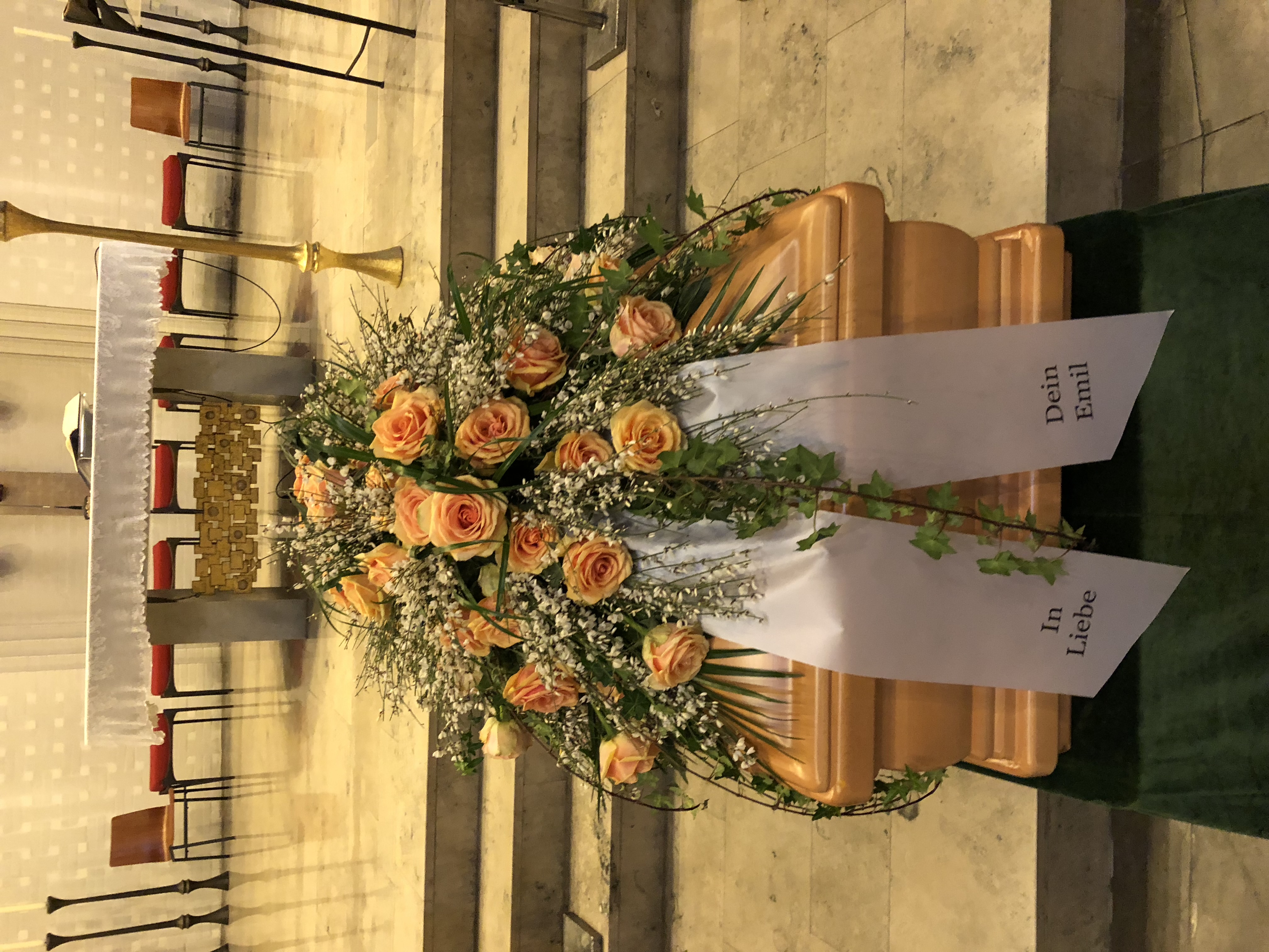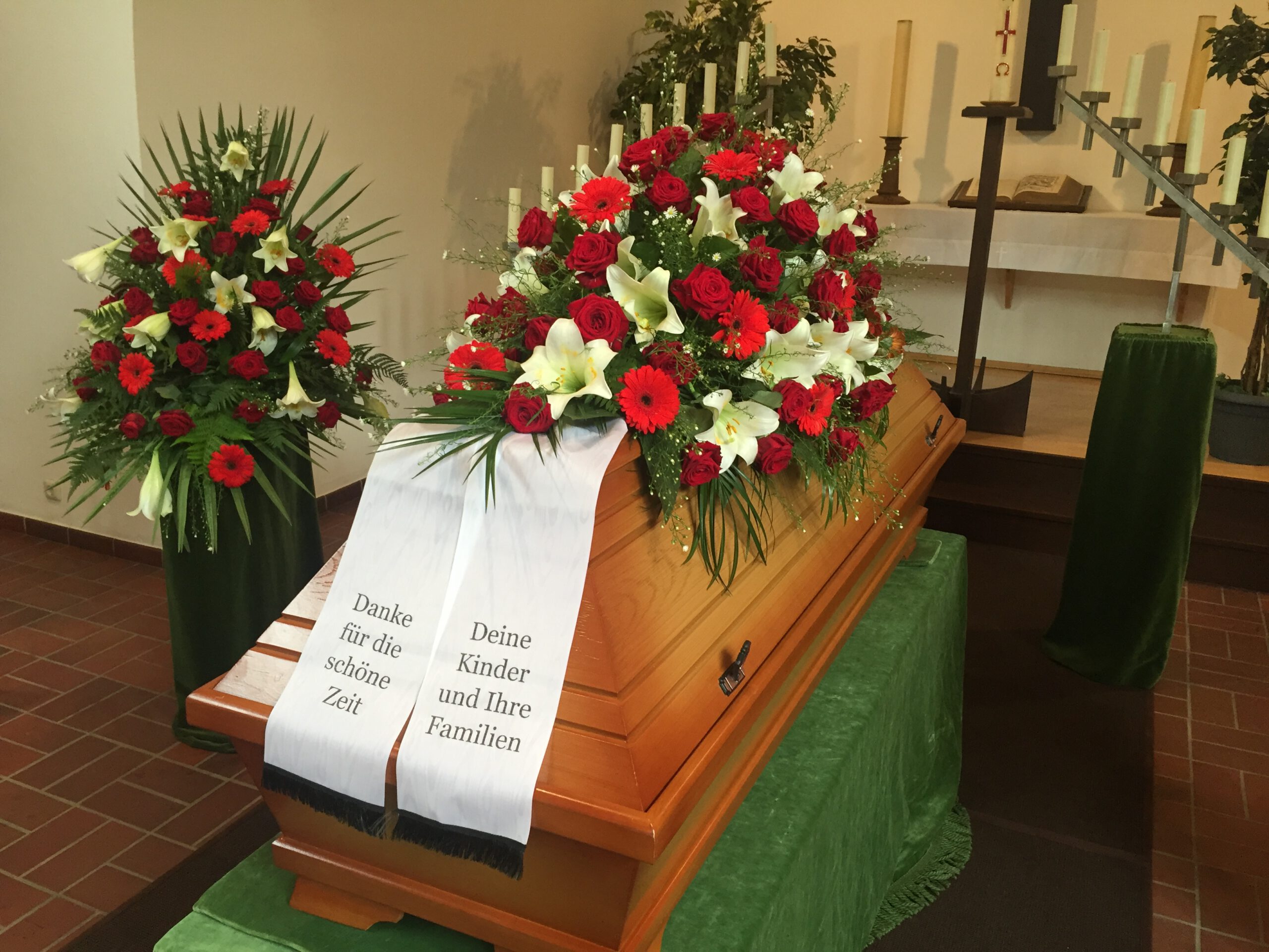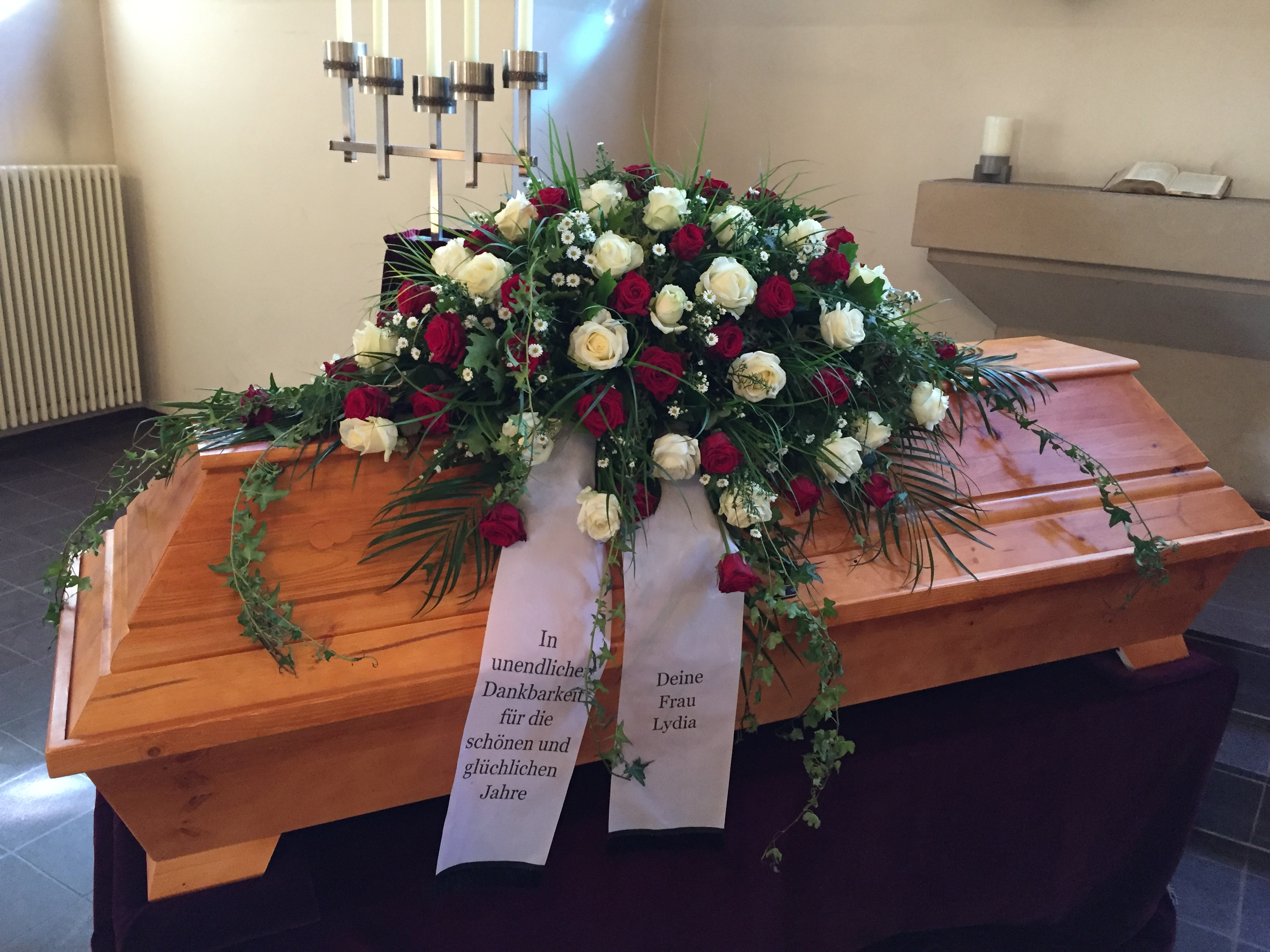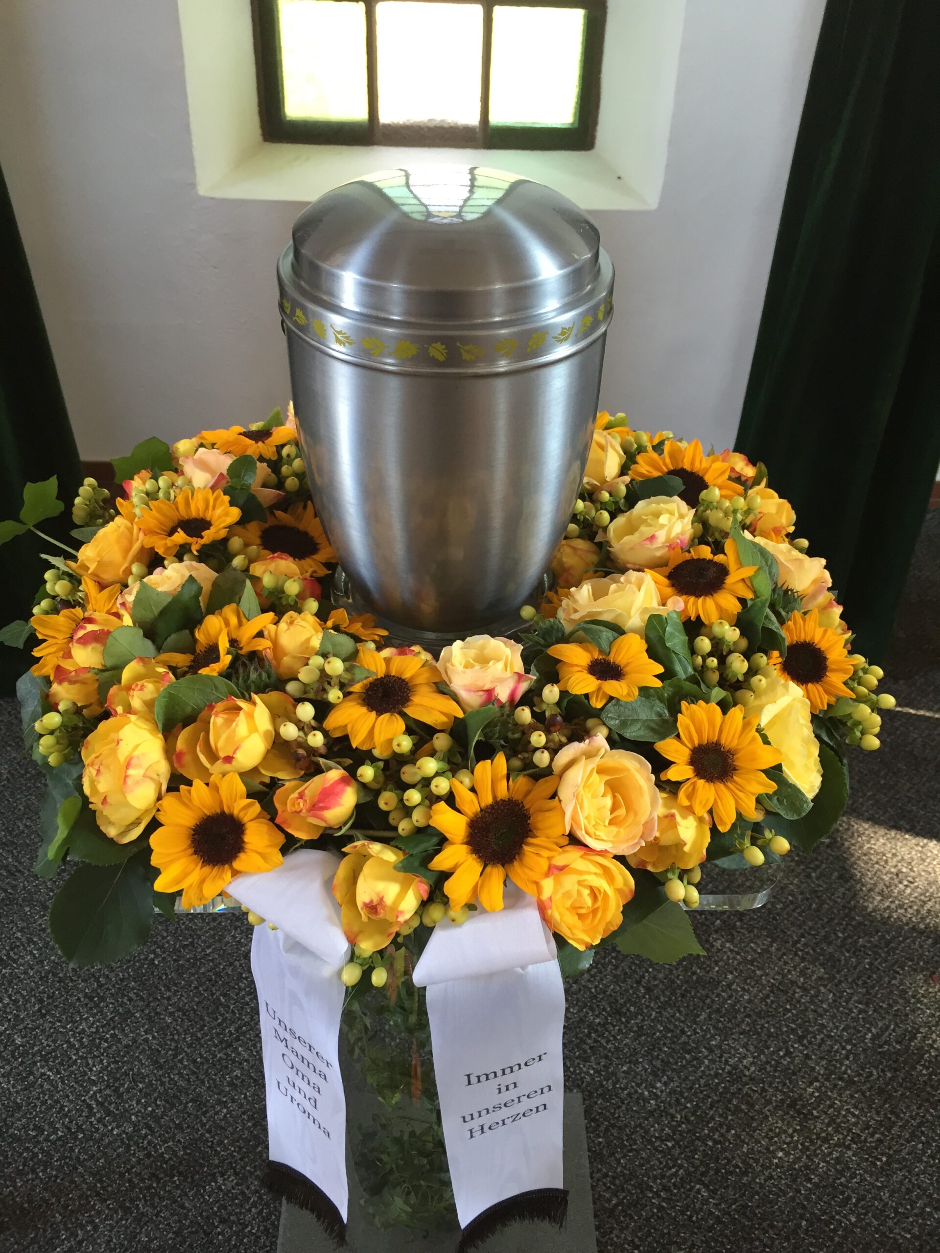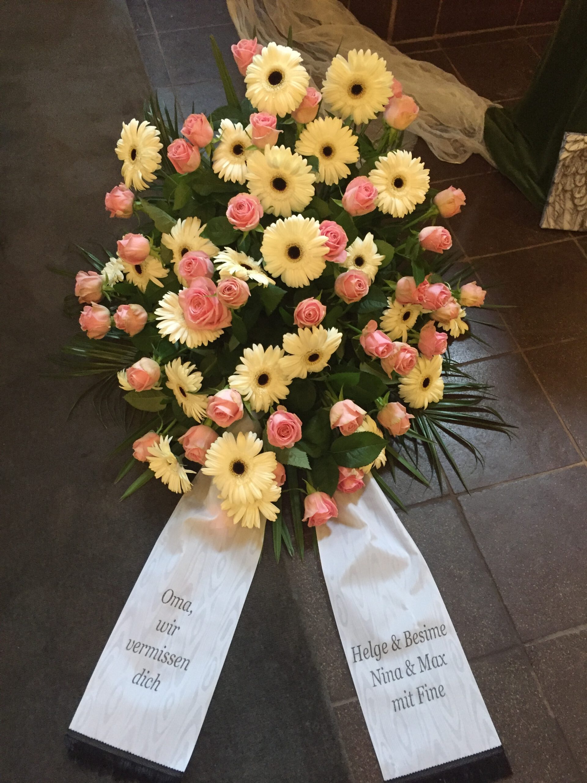 Passend zu Ihren Erinnerungen möchten wir das florale Umfeld schaffen. Dies wird den Abschied vermutlich nicht erleichtern, aber einen schönen Rahmen schaffen. Wir fertigen für Sie Sargdekorationen, Säulengestecke, verschiedene Trauergestecke, Trauerkränze, Liegesträuße und Urnenschmuck an. Ebenfalls ist es möglich einzelne Blumen oder Blütenblätter als Grabbeigabe zu bestellen. Die Schleifen für Gesteck und Kranz stellen wir in unserer Werkstatt selbst her – ganz nach Ihren Wünschen. Wenn Sie einen letzten Blumengruß für Ihre Liebsten, Freunde und Angehörige bestellen wollen, nehmen Sie Kontakt zu uns auf und wir besprechen Ihre Vorstellungen.