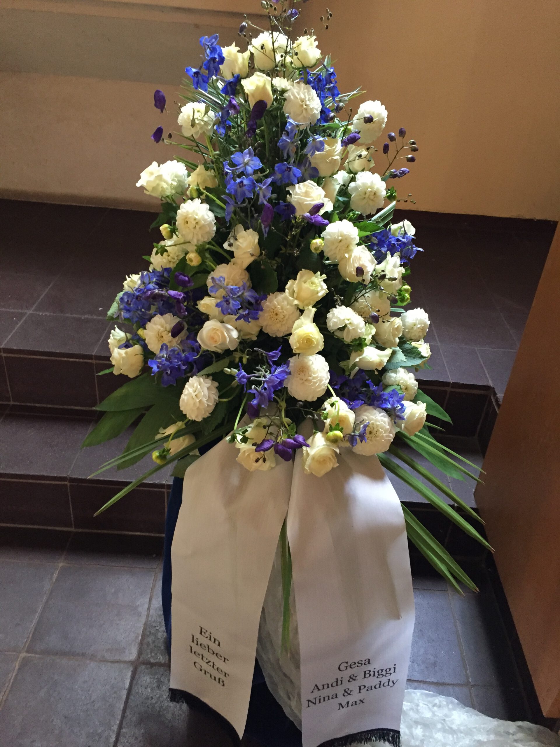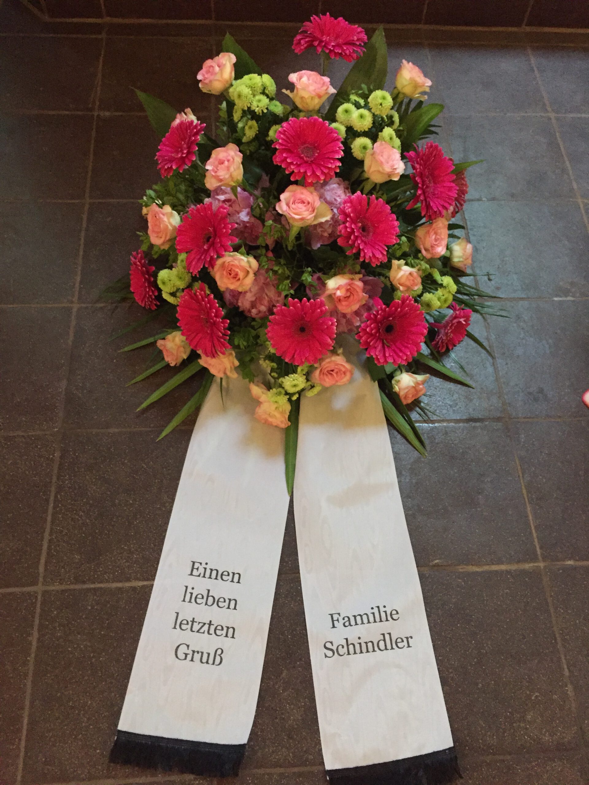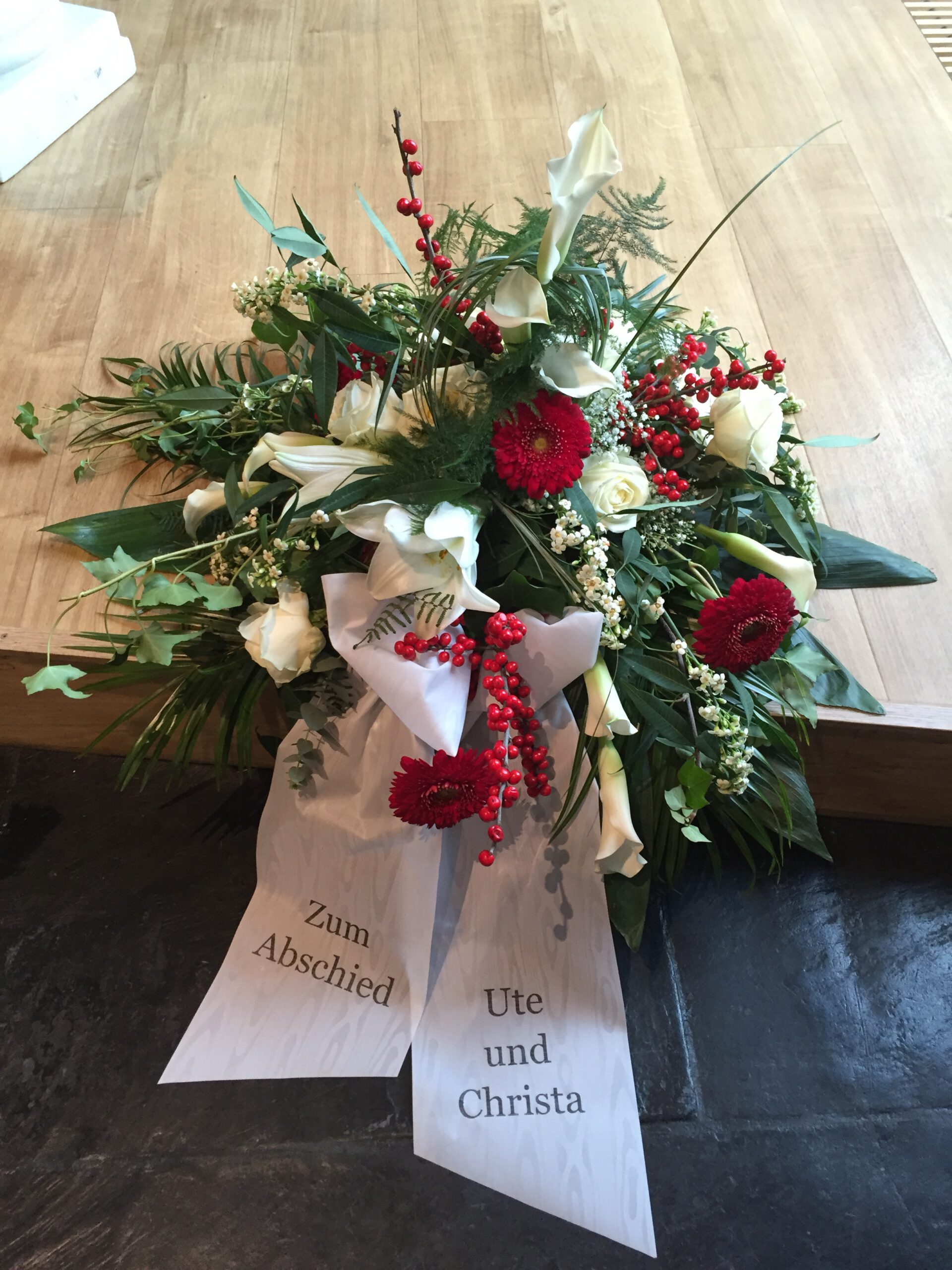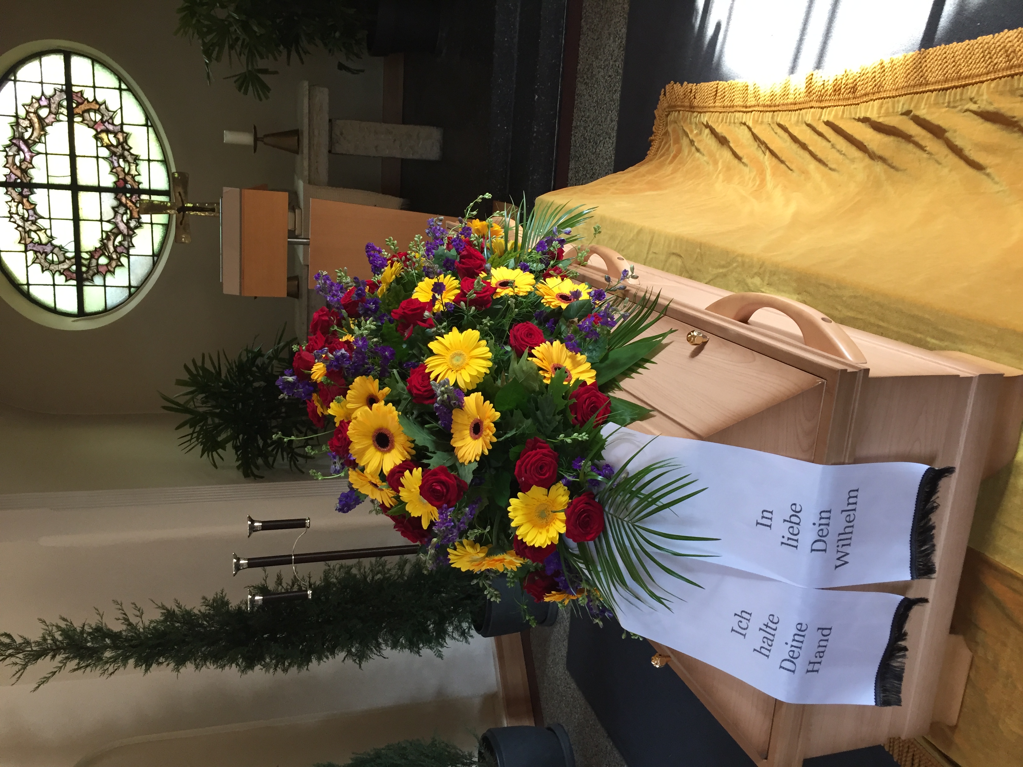 Passend zu Ihren Erinnerungen möchten wir das florale Umfeld schaffen. Dies wird den Abschied vermutlich nicht erleichtern, aber einen schönen Rahmen schaffen. Wir fertigen für Sie Sargdekorationen, Säulengestecke, verschiedene Trauergestecke, Trauerkränze, Liegesträuße und Urnenschmuck an. Ebenfalls ist es möglich einzelne Blumen oder Blütenblätter als Grabbeigabe zu bestellen. Die Schleifen für Gesteck und Kranz stellen wir in unserer Werkstatt selbst her – ganz nach Ihren Wünschen. Wenn Sie einen letzten Blumengruß für Ihre Liebsten, Freunde und Angehörige bestellen wollen, nehmen Sie Kontakt zu uns auf und wir besprechen Ihre Vorstellungen.