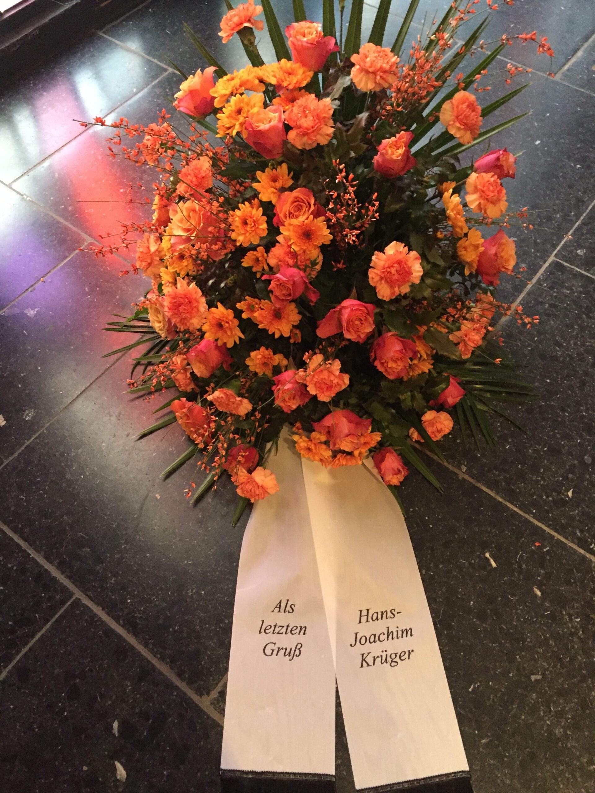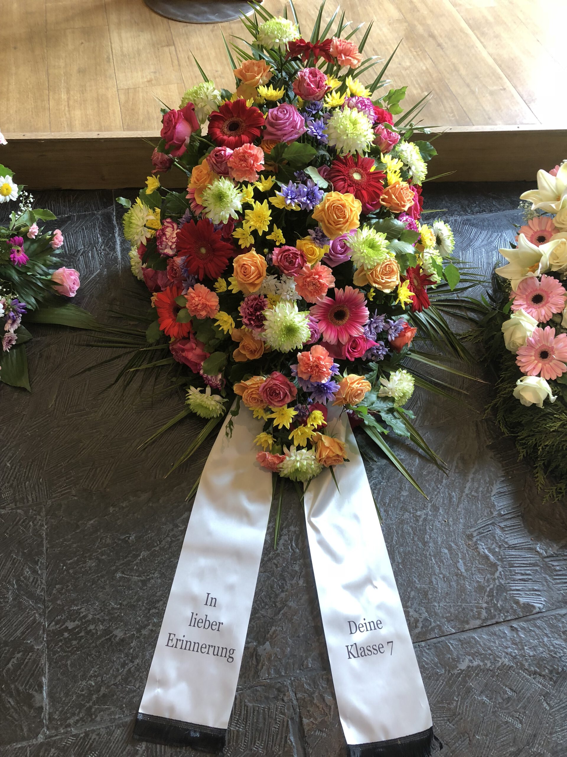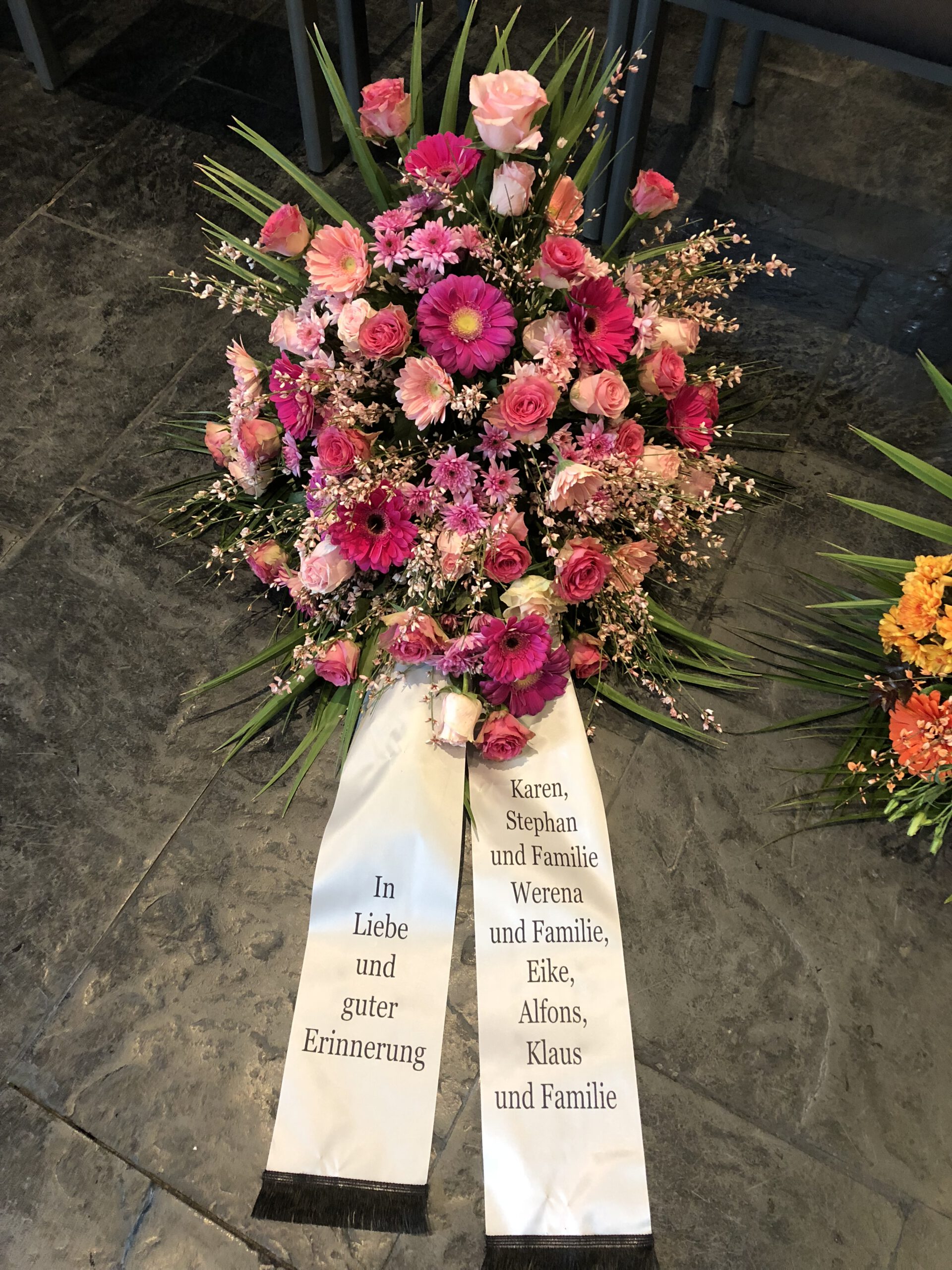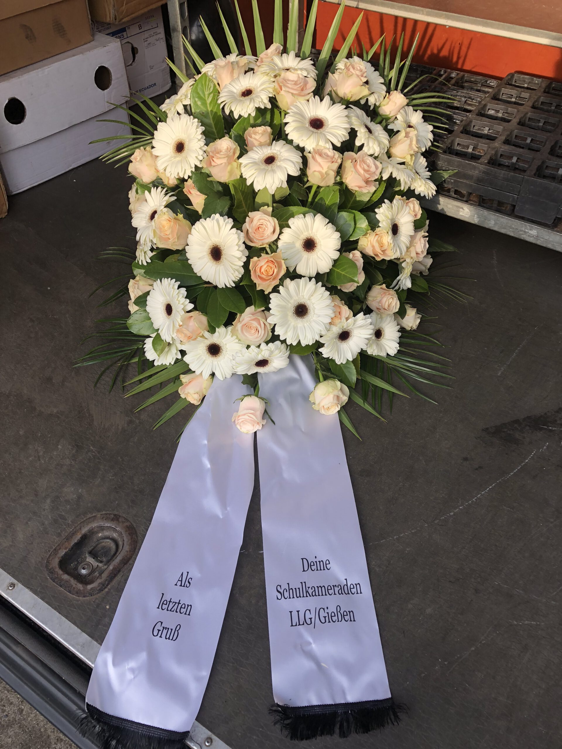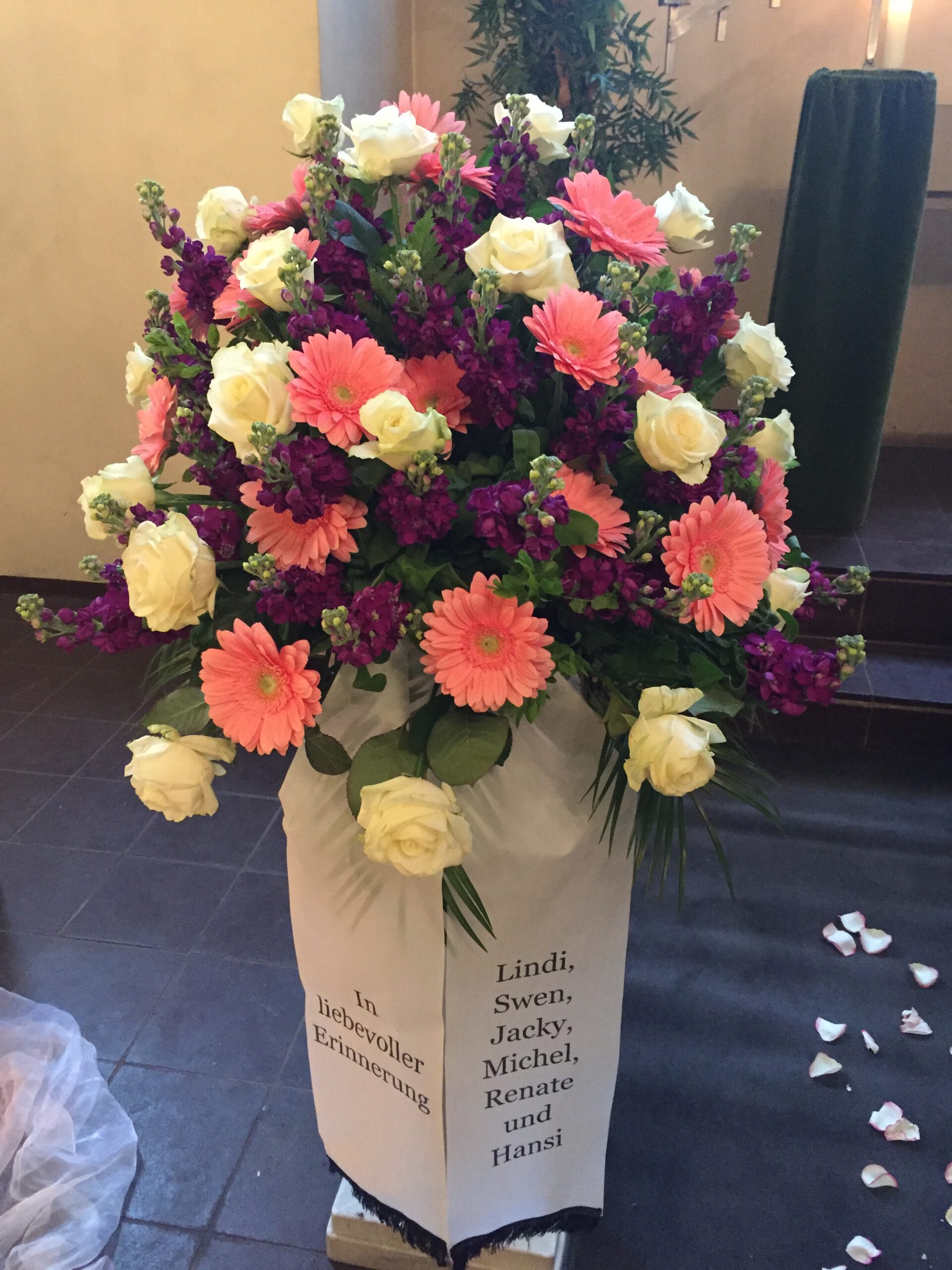 Passend zu Ihren Erinnerungen möchten wir das florale Umfeld schaffen. Dies wird den Abschied vermutlich nicht erleichtern, aber einen schönen Rahmen schaffen. Wir fertigen für Sie Sargdekorationen, Säulengestecke, verschiedene Trauergestecke, Trauerkränze, Liegesträuße und Urnenschmuck an. Ebenfalls ist es möglich einzelne Blumen oder Blütenblätter als Grabbeigabe zu bestellen. Die Schleifen für Gesteck und Kranz stellen wir in unserer Werkstatt selbst her – ganz nach Ihren Wünschen. Wenn Sie einen letzten Blumengruß für Ihre Liebsten, Freunde und Angehörige bestellen wollen, nehmen Sie Kontakt zu uns auf und wir besprechen Ihre Vorstellungen.